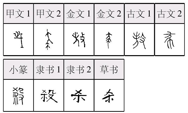 【提示】杀,6画,下从木;旧字形7画,下从术。朩,第二笔是竖钩,不是竖,不要写成木; 第三笔,宋体是撇,楷体是点。 *杀(殺)shā6画 木部 (1) 把活的弄死: ~虫|~敌|~鸡|~菌|自~。 (2) 压低;消除;减少: ~价|~痒|~威风。也作“煞”。 (3) 败坏: ~风景。也作“煞”。 (4) 战斗: ~出重围。 (5) 〈方〉 药物等刺激皮肤或黏膜使感觉疼痛: 伤口用酒精消毒~得慌。 (6) 副词。用在动词后,表示程度深: 气~|恨~|笑~人。也作“煞”。 杀殺shā甲骨文象兽形,也是小篆(yì)字(《说文》载战国杀字作此)的初文。 能杀人。 古音与杀近。也作杀字。杀义指使人或动物失去生命。如:杀敌立功|杀虫药。字形讹变成杀。原在“×”下还多一点。小篆又加殳旁。现以殺为繁体字。杀为规范字。见《总表》。引申为战斗。如:杀出重围。又指消减。如:杀风景|杀暑气。又指收束。如:杀尾(现一般写作“煞尾”)|杀账。又指勒紧,扣紧。如:杀车|杀腰带(杀也作刹,刹本音chà)。 杀殺★繁◎常★常
