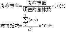 为了使试验数据含有较多的信息而又要节省试验用地和提高试验结果的精确度,可试用回归正交试验设计或回归旋转设计。试验小区的面积大小和形状,以及保护区(行)的设置依试验目的、杀菌剂特性、病害传播方式、施药方法和器械不同而有相应的要求。主要应避免小区施药时不同处理间的边际影响,如药雾飘逸、药剂的气态效应和病原物的短距离扩散等。使用不同器械施药或收割测产时,适宜的小区面积为:手动式为10~100米2;拖拉机牵引为100~500米2或200~400米2;联合收割机为20~500米2;飞机为4喷幅宽,300米长。 人工接种或诱发病害 在气候不利于发病或试验地发病很轻时,往往要采用适宜的方法提高发病率和病情严重度以保证药效试验在比较均匀发病的条件下进行,得到正确的结果。常用的方法有: 种植感病品种,人工培养病原菌进行土壤接种、种子接种或植株不同器官接种。也可喷水或浇水以增加作物株冠层的湿度,选择有利于发病的播种期,加大播种量以增加植株密度或加施氮肥提高植株感病性等。 施药 根据药剂特性,如保护剂、治疗剂、内吸剂、非内吸剂等设计最早施药时间,发病前施药或发病后施药;根据病害特点,如一次侵染、多次侵染、潜育期长短等设计施药次数; 根据药剂和病害特点,设计施药方法,如土壤施药、种子处理、茎叶喷雾(粉)等。 病情调查 常用发病株(叶、秆、果)率代表普遍率,以易染病部位的病情指数代表发病程度。按下列公式计算发病株率和病情指数: