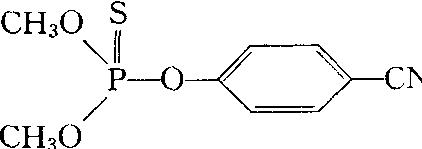 杀螟腈cyanophos广谱有机磷杀虫剂。化学名称:O,O-二甲基-O-(对-氰基苯基)硫逐磷酸酯。化学结构式如下。纯品为白色结晶,熔点14~15℃,工业品为透明的琥珀色液体,密度1.260。30℃时水中溶解度46 mg/kg,可与许多有机溶剂如丙酮、苯、氯仿、乙醇、甲醇等混溶。对热稳定,遇碱水解。具有胃毒和触杀作用,速效而残效较短。可防治蔬菜、果树、豆类及水稻上的多种咀嚼口器和刺吸式口器害虫。也可以用于防治居室内的蚊、蝇及蜚蠊等卫生害虫。对大鼠急性口服LD50为610 mg/kg,急性经皮LD50为800 mg/kg,对鱼类毒性较小。