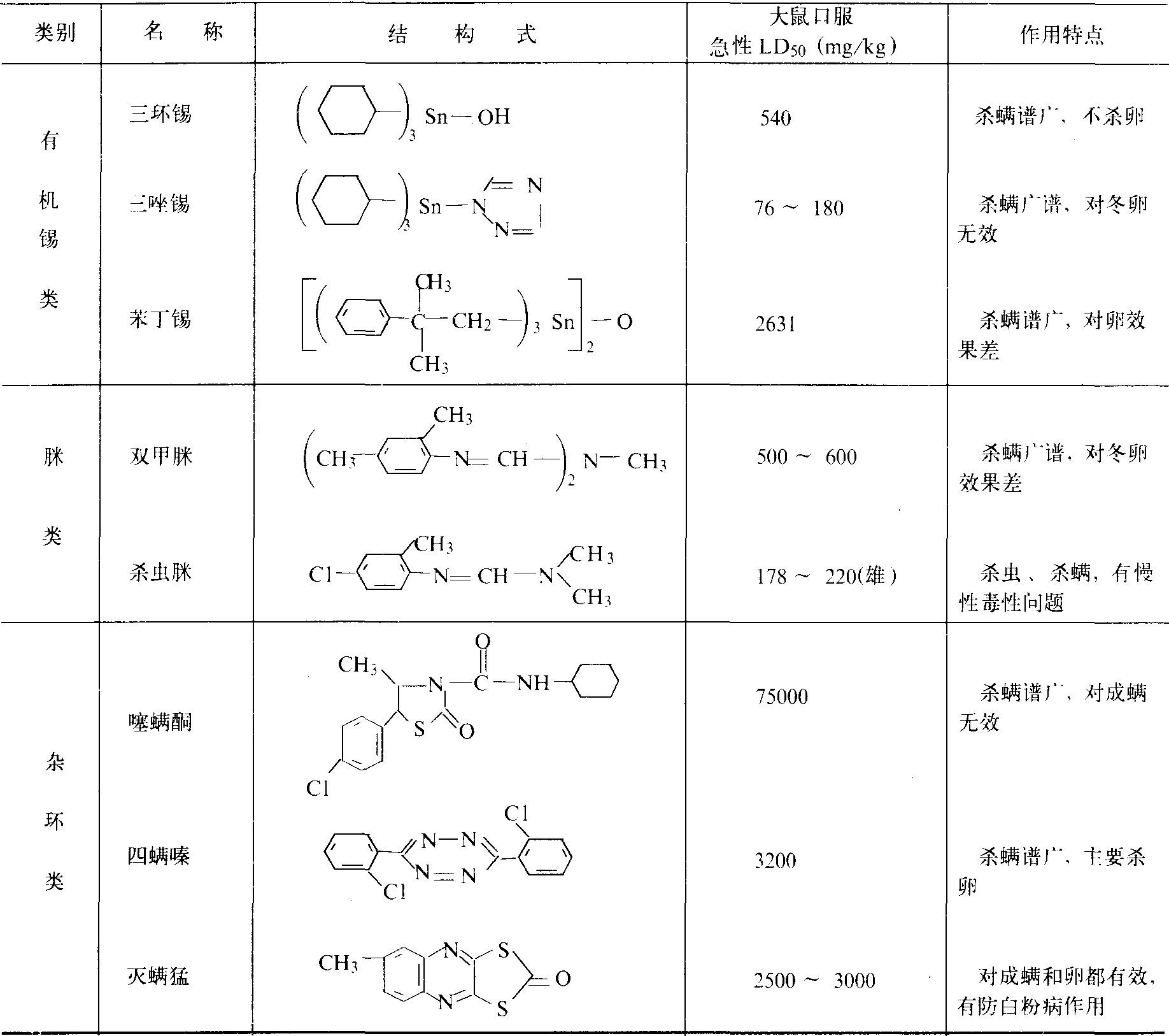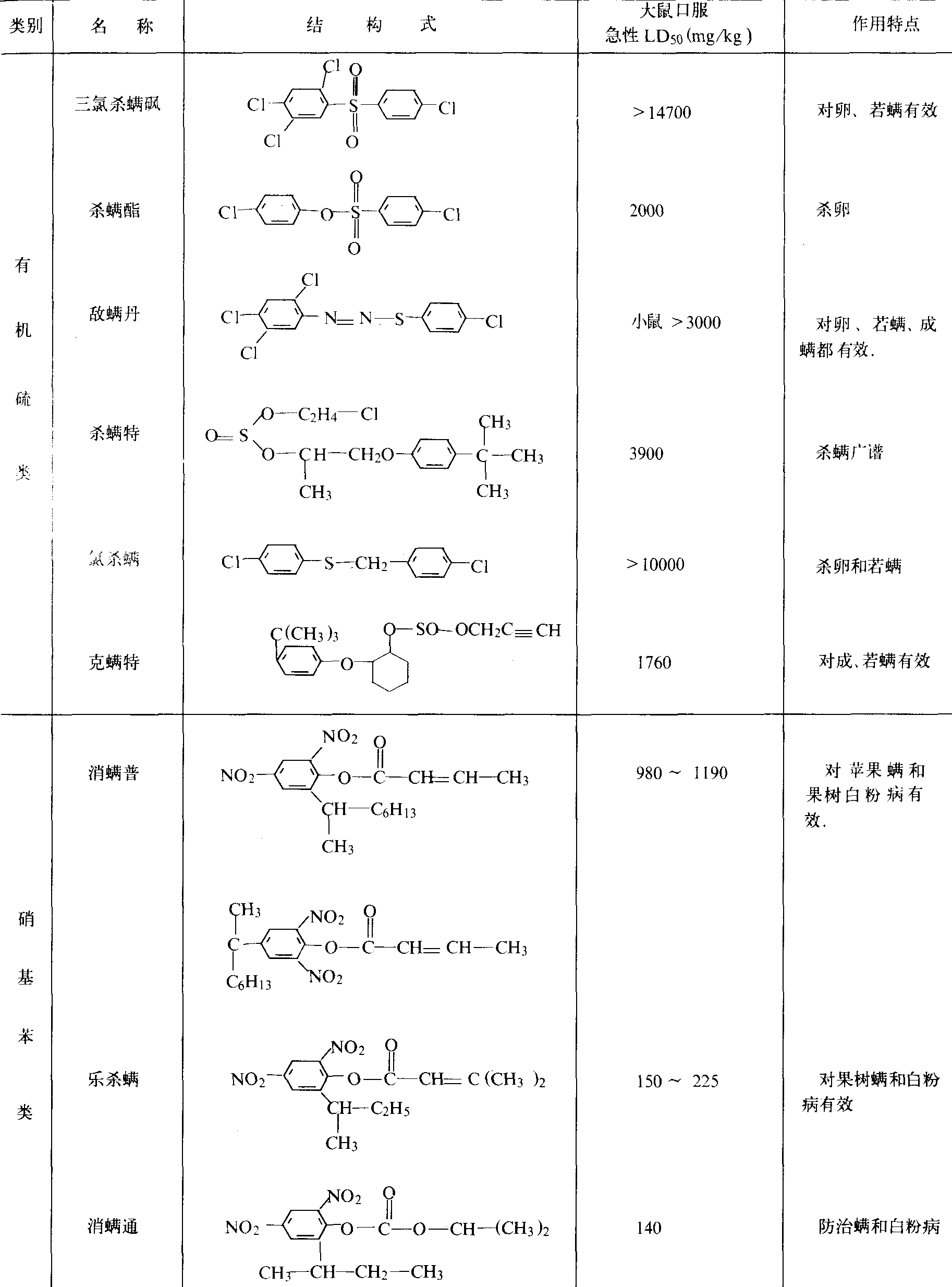 特性 杀螨剂多属低毒物,对人畜比较安全。螨类对杀螨剂产生抗药性较快。不同类型杀螨剂之间通常无交互抗药性。为了防治抗药性螨和延缓螨类抗药性的发展,应重视不同类型杀螨剂轮换使用或混配使用。现有杀螨剂都无内吸传导作用,喷药必须均匀周到。有的杀螨剂杀卵活性高,不杀成螨,有的则相反这样的两类药剂配合使用往往能提高杀螨活性。专用杀螨剂多无杀虫作用。 杀螨剂acaricide用来防治为害植物的各种蜱螨的农药。蜱螨包括有叶螨、跗线螨、真足螨、瘿螨、粉螨及镰螯螨。专一性的杀螨剂只对蜱螨有杀伤作用,对昆虫无毒效,如三氯杀螨醇、克螨特、螨卵酯等。杀虫剂中有机磷化合物有很强的杀螨作用;杀菌剂中的硫磺和一些有机硫化合物也有杀螨作用。 杀螨剂用于防治植物螨类的农药。如克螨特、扫螨净等。按照化学结构可分为17类:硫磺类、二硝基酚类、二苯基醇类、二苯氧基甲烷类、二苯基矾类、二苯基磺酸酯类、亚磺酸酯类、二苯基醚类、二苯基硫醚类、喹 杀螨剂acaricide |