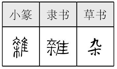 【提示】朩,中间是竖钩,不是竖; 第三笔宋体是撇,楷体是点。 *杂(雜)〔襍〕zá6画 木部 (1) 各种各样的: ~货|~粮|~技|~色|复~。 (2) 混合: 混~|掺~|夹~。 (3) 正项以外的;正式的以外的: ~费|~项|~牌军。 杂雜襍zá小篆以来的形声字。作雜。从衣,集声。衣在偏旁中作一点一横,下从两人,形变如衣、十(衣下连一斜横似“十”)为卒例。集与杂音变如立拉、契葜(qiā)、吉黠(xiá)例。都是入声或入声与去声演变例。隶楷也多作左衣旁,右从集。《集韵》或从衣集。现作异体字。见《异体字表》。本指衣服五彩相会。引申为驳(bó,指颜色不纯)杂不纯。再引申为多种多样的,不单纯的。如:杂色|杂事|杂技|人多手杂。组词如:杂志。又引申为掺杂,混合。如:夹杂|掺杂。|汉代以后碑文和六朝以后草书里有作从杂从隹(zhuī)的。卒字头、隶楷常作“九”,从草书来,如晋代以来草书卒字作“九、十”。近代现代有省隹旁作的。 现代群众再简化作杂。 现作规范字。见《总表》。 杂雜★繁◎常★常