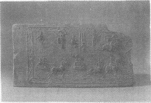 东汉。长63.5厘米,宽33厘米。河南南阳新野出土。河南省文物研究所藏。由模制高浮雕法刻成。画面自右起,上方为一回身引弓射箭、骑马飞奔的勇士,下方为一负竿引路、缓辔前行的骑士,其后跟随两辆各竖一橦、坐一驭手的戏车。前车立橦顶端横木上倒挂一人,其两臂平展,掌心向上,手内托着球,球上各立一人,作悠然表演状。后车立橦顶端横木上蹲一人,与前车车厢内的一个人共拉一软索,斜成一个角度,斜索靠上端处一人两手上举,稳步而上,正在表演走钢丝。我国杂技兴起于春秋时期,到了汉代有了长足的发展。李尤《平乐观赋》载:“戏车高橦,驰骋百马;连翩九仞,离合上下”即是对戏车的描述。有关戏车的画像在山东省沂南汉墓中已有发现,但似此集戏车,橦顶人物倒挂和履绳索于一体,特别是以戏车联索的高难动作的表现,还是首次发现。这为研究我国古代杂技艺术史提供了宝贵的形象资料。