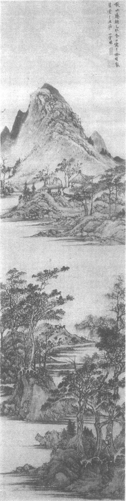 明。纸本设色。李士达绘。纵25.8厘米,横140.5厘米。江苏省苏州博物馆藏。李士达见《李士达三驼图轴》条目。这是一幅描绘文人墨客雅聚西园,尽情欢乐的工笔重彩人物画。秀美怡人的西园中,假山如壁,翠竹成林,流水潺潺,数十个学士才女在如盖的松荫下,或奋笔疾书,或挥毫作画,或闲庭信步,或伫足远眺,或弹琴,或小憩……三三俩俩,各行其事,各尽其乐。其间还有捧壶的侍童、恭立的仆人等。画幅布局平稳,人物形象生动活泼。设色浓艳,青绿朱赭、红白黄墨无所不具。勾勒细致,大到坡石,小至苔藓,一丝不苟。丁云鹏秋山远眺图轴 明万历四十三年(公元1615年)。丁云鹏绘。纸本墨笔。纵129.2厘米,横33.6厘米。江苏省苏州博物馆藏。丁云鹏见《丁云鹏观音图轴》条目。此图由萧疏的杂树、坡石、空濛的平湖、落寞的亭屋、寂寂的远岫组成一幅清旷幽静、安谧淡雅的秋日山林景致。墨色秀雅,笔法多变,风韵隽永,诗意盎然。图的右上角有款署“秋山远眺,乙卯冬日写于榆树聚星堂之左厢。丁云鹏”。下钤白文<云鹏>,朱文<南羽>两方印。