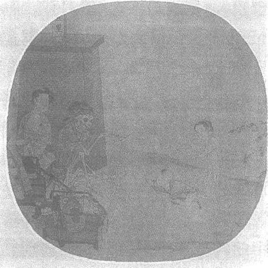 宋,李嵩(见《李嵩货郎图卷》条目)绘。绢本设色。北京故宫博物院藏。此图描绘的是骷髅与一小儿幻戏的情形。图的左边绘一席地而坐的大骷髅,其头戴朴冠,上身着色衣,下身枯骨裸露,右手悬挑戏弄着一个作屈身招呼状的小骷髅,其身后有一妇人袒露胸乳、怀抱婴儿哺乳,神情惶然地注视着幻戏情景,骷髅两侧衬托着用密线重墨绘成的高大墩子和矮小货担,增添了死阴可怖的气氛。图的右边,与大小骷髅相对的是一生命力旺盛的小儿,左手和双足爬地,昂首,前伸右臂,与作屈身招呼状的小骷髅相呼应,小儿身后有一妇人神情惶慌,伸展双臂欲上前阻拦,与骷髅身后惶然注视着的妇人形成比照。小儿两侧明净空旷,后边烘托着充满生机的绿叶。此图在布局上着重对比,生与死、动与静、疏与密、虚与实、轻与重等。线条、色彩和谐地统一在画面之中。在墨笔技法上,运笔工细劲利,形象刻画得生动逼真,设色亦浓淡相宜,是一部寓意深邃、画技高超的佳作。