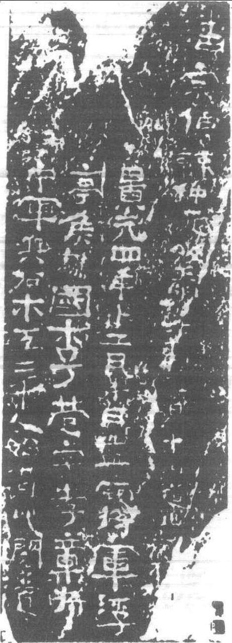 李苞開閣道題記 (局部) 一曰〈盪寇將軍李苞題名〉。三國魏景元四年(263)十二月刻。刻于陝西褒城縣石門摩崖。正書,凡三行三十八字:“景元四年十二月十日,盪寇將軍浮亭侯譙國李苞字孝章,將中軍兵石木工二千人,始通此閣道。”南宋晏袤訪得,傍刻釋文與記。此書文字參差不一,書法美妙,古拙無波磔,間有隸書筆意。清楊守敬 《平碑記》 謂為:“亦疏古一派。” (見 〈褒斜道刻石〉) 此處尚有各種摩崖刻,本石右上刻有〈潘宗伯等造橋題記〉。