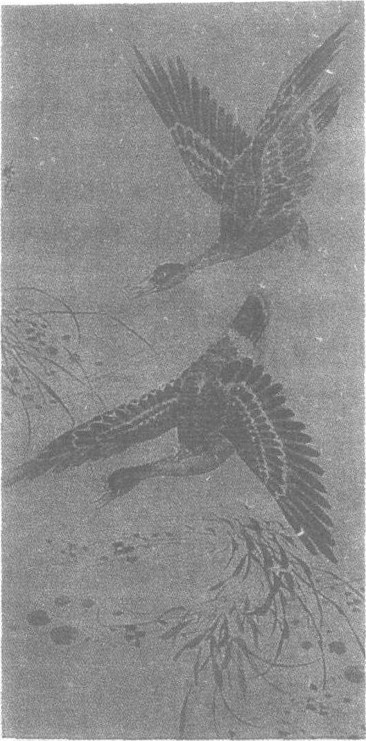明。林良(见《林良双鹰图轴》条目)绘。绢本墨笔。纵138.5厘米,横69.8厘米。北京故宫博物院藏。此图描绘两只飞向芦塘的大雁。湖水平展,苇叶偃垂,水草飘摇,浮萍点点。大雁前后相随,俯身下翔,似欲滑落水上,又似准备掠水而过。它们伸着脖子齐声鸣叫,前面的一只两翼下展,后面的一只双翅上举,动作前后承连,很有节奏感。清澈的湖水被雁翅舞出了几丝浅细的涟漪。这一细节处理更给画面增添了幽静清寂的情调。此图用笔逸放,墨色润淡,构图简括,风格沉雄潇洒,苇丛以草书笔意写成,浮萍用润笔圆点而出。芦雁点染擦涂结合,简朴生动,形神皆妙。图中款署“林良”二字。