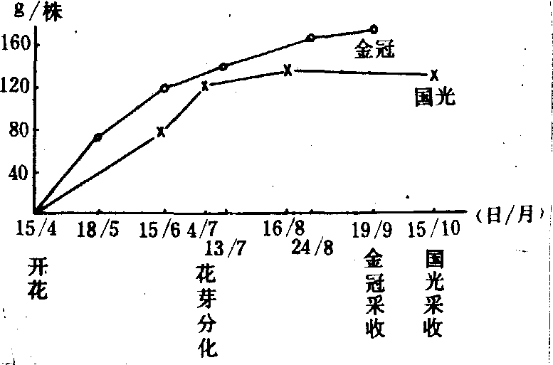 图1 苹果新生器官中氮素总量的变化 磷、钾肥既可作基肥, 与有机肥料拌在一起, 在秋施肥时施用, 也可作追肥, 在早春萌动前施用, 或生育后期作为根外追肥。这些时期施用磷、钾肥, 既有利于根系和新梢的生长, 也有利于促进花芽分化和提高果实品质(图2)。 施肥方法 上壤施肥应根据各种果树根系分布的深广度, 以及施用元素在土壤中淋溶难易, 移动快慢等条件, 把肥料施送到根系集中分布较深和稍远的地方, 以诱导根系向深广伸展。因此, 作为基肥施用的有机肥料, 一般采用沟施, 即在树冠外围的地方, 挖井字形或半圆形深沟, 沟宽30~40厘米, 深及根系集中分布层以下,长度依肥料多少而异。肥料施入沟后,先与沟底土壤掺匀, 然后覆土。幼树期应逐年把施肥沟外移、加深; 大树园内根系、交叉满布, 可采用全园撒施, 然后深耕翻, 将有机肥翻埋在深处。也可在每一行间开贯穿全园的深沟, 沟上宽60~100厘米,下宽80~150厘米, 深60~80厘米呈梯形, 结合基肥,进行深翻改土, 株间可隔年轮换进行。 113