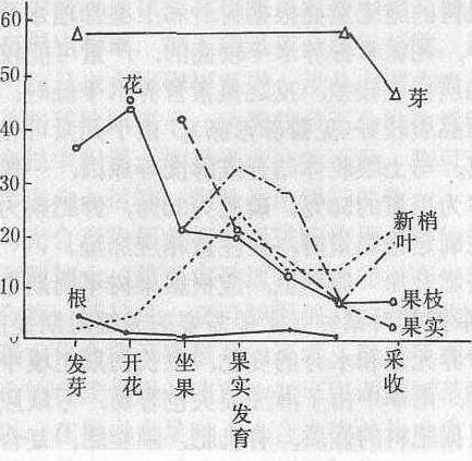 图2 苹果不同器官吸收磷的强度 氮素化肥易溶于水, 可以浅施,避免流失; 磷、钾化肥在土壤中移动较慢, 尤其是磷肥, 应施于根系集中分布层次, 而且最好与有机肥混合施用, 以利吸收利用。 氮、磷、钾肥最好配合施用, 比单施时可以发挥更大的肥效。增氮时增施磷、钾, 可以提高果实品质,和抵抗贮藏期病害的能力; 秋施还可增强枝条中淀粉和糖的含量, 提高抗寒力。 施用时, 还须注意肥料的特性。石灰氮、碳酸氢铵不宜在果树上直接施用;氨水深施后要立即覆土;在盐碱土上则慎用氯化铵或氯化钾。 |