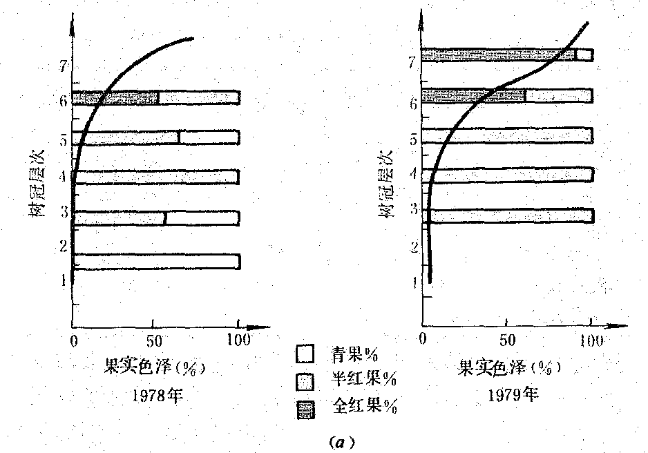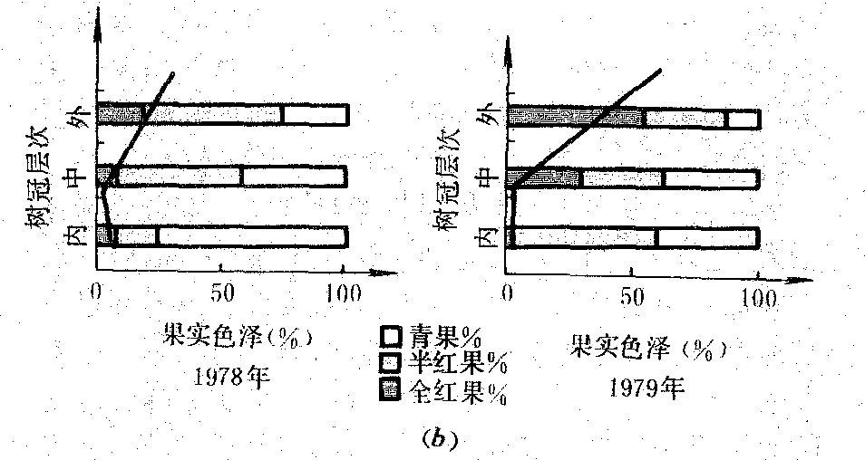 图 2(b) 树冠横向不同部位光分布对果实品质的影响 水分 果园水分过多或不足都会加速果树衰老,缩短结果年限。一般土壤水分保持在田间持水量60~80%,根系可正常生长。各种果树蒸腾系数如表3。果树在各物候期对水分要求不同, 通常落叶果树在春季水分不足时, 延迟萌芽或萌芽不整齐。花期干旱或降雨过多常引起落花落果。大气湿度不足可缩短花期,影响授粉、受精。新梢生长期为需水临界期, 如供水不足, 则削弱生长, 以致提前停止生长。花芽分化期需水相对减少, 水分过多削弱分化。幼果期缺水, 影响果实肥大, 引起落果, 但在秋季(果实生长后期)雨水过多, 梢停止生长晚, 抗寒力减弱, 削弱越冬性,冬季缺水, 常使幼树枝条因失水而干枯,称为“抽条”。因此应在冬季灌足封冻水, 对干旱地区少雪年份尤为重要(见果园小气候)。 表3 各种果树蒸腾系数