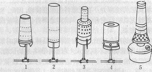 果园加热器 1~4. 油压式果园加热器, 用2号柴油, 自控点火;5.大型锥形加热器 对易受霜冻的果树, 要加强管理,提高抗冻能力;对已冻果树, 应采取人工授粉, 根外喷肥等办法, 提高坐果率, 增加产量, 并恢复树势。 |