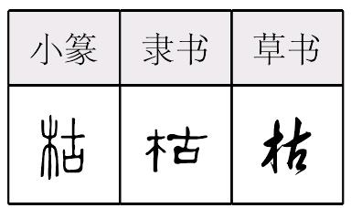 [木(意符)+古(聲符)→枯(《説文》:“枯,槀也。從木,古聲。《夏書》曰:‘唯箘輅枯。’木名也。”枯,失去水分〈乾枯、枯萎〉;没趣味,無生趣〈枯燥〉。)]