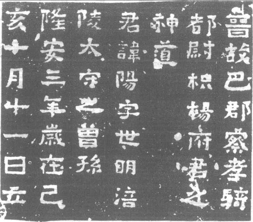 | 释义 | 枳陽府君神道闕東晉·隆安三年 (399) 刻。隸書七行,行七字。立于墓前參道上。石柱上部殘欠,東晉石刻遺迹少見,此闕為人珍重。書體類<谷朗碑>,似隸,似楷,方形古厚,有魏、晉宗風,實為楷書之濫觴,可窺由隸變楷之軌迹。繆荃孫稱“為漢人遺則。” 汪鋆以為 “與 <爨寶子>殆同。”此南朝人書,風尚宗 “北派”,呈分隸古意,堪稱一奇。清代出土四川巴縣,為姚氏 (姚觐元)咫進齋舊藏,後經遞傳,歸長白端方。