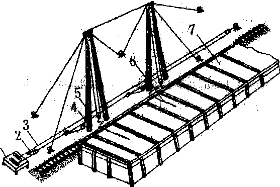 架杆兜卸机 1.绞盘机; 2.荷重牵引索; 3.回空索; 4.起重索; 5.架杆; 6.兜卸索; 7.造材台或卸车台每一副架杆有两组,相距8~10米。每组架杆用两根长14~16米优质松原木组拼成平面结构。直立架杆的顶端安装金属联结套,以便悬挂固定滑轮组和绷绳;下部埋入土中约2米,立放在横木上以增加承压面积。每组架杆用2~3条绷绳以保证架杆工作的直立状态和稳定性。 ❸钢索导绕系统。包括起重索系和牵引索系。起重索系的起重索一端联结有挂钩,另一端依次穿过每组架杆底部的转向滑轮,顶部悬吊的固定滑轮组和动滑轮组,最后固定在动滑轮组上。起重索的直径视滑轮组的倍率和起重量的大小选定。在牵引索系中,荷重牵引索与回空索相联,组成封闭索系。为了增强荷重牵引索的牵引能力,通常在地面设置增力滑车。此外,在荷重牵引索上还插接有与起重索挂钩相对应的联挂铁环。荷重索的直径通常与起重索相同。 ❹兜卸索。是架杆兜卸机的主要荷重挠性构件,其一端插成索套,另一端引至卸车台上,沿台面横向延伸5~8米,穿透台面牢牢地固定在埋深为2米左右的横卧木上,埋坑用石块回填。 ❺卸车台。又称造材台。按台面支承结构分为柱式(木桩、钢柱、水泥柱)和笼式(周围筑墙,中间填土)。卸车台的高度按运材车辆和选材设备的型式确定,为了满足造材和选材滚木的要求,台面设有5~7%的横向坡度。每一节卸车台的长度视原条的长度而定,一般为25~30米,卸车台的宽度以9~13米为宜。 性能 架杆兜卸机的起重能力可达到20~30吨,起升原条捆的高度1.4~2.4米,兜卸原条捆的横向移动距离为2~6米。起升滑轮组的倍率通常是3~5。一台绞盘机能配备4副架杆或4节卸车台,台班产量最高可达800~1000立方米。但是由于到材不均衡的影响,架杆兜卸机的时间利用率一般只有0.3~0.5,台班平均产量仅400~500立方米。根据今后发展趋势,在大、中型贮木场中,架杆兜卸机将逐步被林用龙门起重机所代替,但在原条到材的小型贮木场,架杆兜卸机仍是主要的机型。 |