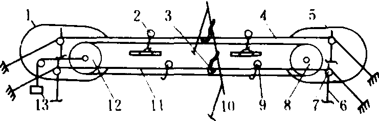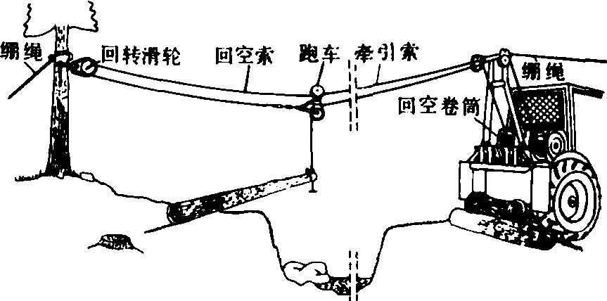 图1 自走绞盘机单跨式索道 的坡度、距离300~500米的条件下运输。这种索道架设方便、移动速度快。除用于农业运输外,还广泛用于林业集材作业。它的牵引索和回空索常用直径8毫米的钢丝绳,绷绳用直径15.5~18.5毫米的钢丝绳。绞盘机的两个卷筒均为缠绕式,牵引力一般为20~30千牛。跑车及回转轮均采用3吨载重能力的滑车。跑车下或牵引索端可挂料斗或夹具等。运输时,分别收、放两卷筒的钢丝绳,可使跑车行驶到装料地点;放松钢丝绳使跑车下面的料斗下垂到离地面0.5米以下,以便装料;最后收紧钢丝绳使料斗升至适当高度悬空,两卷筒的同步器使进、出的钢丝绳保持同一运行速度运输。当运输较长木材并且重量超过1吨时,应使木材一端悬起、另一端呈拖地状态运行。如果没有同步器只要司机熟练也可运行,及时调整各卷筒速度使两根索保持相近的垂度,这时运行状态木材悬吊端呈上下起伏。双线循环牵引式索道 多料斗循环运行山上、山下两点之间的永久性设备(图2)。适于常年运输,运距为1~3千米,生产率较高。其构造和工作过程如下:由两根平行架空的承载索和两端的架空钢轨构成循环承载系统。承载索由支架上的支承鞍座或托轮架空,张紧后与地面锚结。驱动轮始终以一定的转动方向和每秒1米的速度驱动循环索(整圈闭合式牵引索)。在循环索回转轮上连着重锤,保证循环索在一定张力下运行。夹索器使跑车与循环索挂结或脱开。空跑车在装车站台装车,装满后将跑车推至重车承载索并与循环索挂接,跑车被牵引到卸车站台与循环索脱开,在卸车站台卸车。卸货完毕后将跑车推到空车承载索重复牵回。