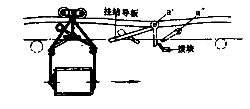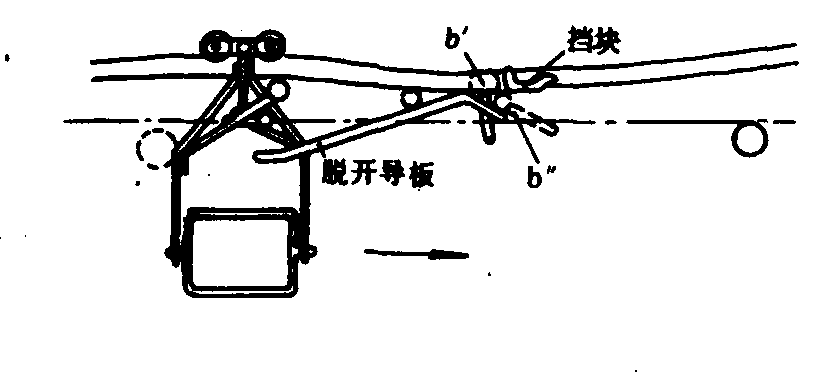 图2 双线循环牵引式索道 1.架空钢轨(卸车站台);2.重载跑车;3.支承鞍座;4.重车边承载索;5.架空钢轨(装车站台); 6.站内支架; 7.支承托轮;8.驱动轮; 9.空跑车; 10.支架;11.空车承载索; 12.循环索回转轮; 13.重锤 跑车 承载索上悬吊的载货装置,依夹索器的不同有多种类型。常用的有螺旋式夹索器跑车,适用于索道平均坡度在20°以下;重力式夹索器跑车,适用于索道平均坡度在20°~38°。 螺旋式夹索器跑车,主要由螺杆、滚轮、摇杆、夹钳、吊架及螺旋式夹索器组成。夹索器安装在跑车的吊架上。夹钳的左、右两片钳口装在螺杆上。左钳口带有左旋粗螺纹,右钳口带有右旋细螺纹。在螺杆端部的摇杆上装有滚轮。当跑车进、出站口时,滚轮沿挂结导板或脱开导板滚动,从而使摇杆和螺杆一起转动。螺杆转动很快地向循环索靠近,开始接触循环索时钳口就停止不前。摇杆继续转动时,右钳口继续缓慢向内移动,并以很大的压力将循环索压紧在已停止不动的左钳口上。当摇杆向相反方向转动时,两钳口向相反方向移动放开循环索。 螺旋式夹索器夹索与脱索控制机构与工作过程如图3所示。夹索过程:首先人工将跑车推到夹索导向装置处,那里的架空钢轨有一定的倾斜度,以便使跑车的速度能增大到和循环索的运行速度相同。夹索器摇杆上端的滚轮沿挂结导板上升,顺时针转动到垂直位置a′时,夹钳开始和循环索接触、跑车继续运行,摇杆铰轴下端悬臂与拨块相碰撞后滚轮迅速滑落,以顺时针方向转到a″的位置,这时循环索在夹钳中被很大的压力压紧。夹钳螺母的细螺纹有自锁作用,因此夹钳的夹持力可保持不变。脱索过程:当摇杆上的滚轮行驶到脱开导板上,摇杆反时针转动到b′,此时滚轮继续向前运行而受挡块阻挡使摇杆反时针转,倒向左边b″位置,这时夹钳全部张开与循环索脱开。