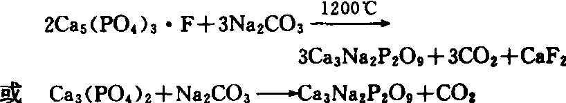 然后经冷却、干燥、磨细制得。 脱氟磷肥的主要化学组成为a-Ca3(PO4)2、4CaO·P2O5·CaSiO2和Ca4SiO2。含磷量(P2O5)一般为18%~32%,能溶于柠檬酸铵溶液中,呈碱性褐色或浅灰色细粉末,细度要求一般为90%通过80目筛,不吸湿,不结块;散落性好,便于贮藏、运输和施用。含氟量低于0.2%时,还可作饲料添加剂。脱氟磷肥的施用方法参见钙镁磷肥。据中国22个省(市、自治区)对25种作物的100多个试验统计,脱氟磷肥对各种作物均有增产效果,在酸性土壤上其肥效高于过磷酸钙、钙镁磷肥和磷矿粉。 钙钠磷肥(rhenania phosphate) 又称煅灼磷肥、瑞纳磷肥和碱熔磷肥,是一种含钠的磷酸钙复盐。在1917年由德国最先生产,将纯碱、石英和磷矿石混合后在1100~1200℃下煅烧,煅烧物用水骤冷再磨细制得,含磷量(P2O5)为28%左右。前苏联采用磷灰土与25%~50%碳酸钠共同熔融,可制得全磷量(P2O5)为22%~25%(其中有效磷占全磷量74%~98%)的钙钠磷肥。其反应式为: