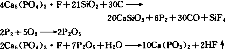 若用碳酸钾代替碳酸钠,可制得含钾的煅灼磷肥。呈中性柠檬酸铵溶性,碱性,褐灰色或灰色粉末,细度为90%通过70目筛孔,不吸湿结块,物理性状良好,施用方法参见钙镁磷肥。 偏磷酸钙(calcium metaphosphate) 钙的偏磷酸盐,又称玻璃肥料。先以电热还原法处理磷矿石,用煤或焦炭作还原剂,以二氧化硅为助熔剂,在1000℃以上的高温下,磷酸钙盐中的磷还原成黄磷(元素磷),又将黄磷在空气中燃烧成五氧化二磷蒸气与磷矿石反应,磷燃烧所产生的高温将物料熔融,物料从反应炉流入用水冷却的转鼓内固化成玻璃态物质,再经冷却、破碎即得。其反应式是: