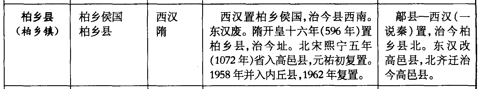 柏乡县(柏乡镇)柏乡侯国柏乡县西汉隋西汉置柏乡侯国,治今县西南。东汉废。隋开皇十六年(596年)置柏乡县,治今址。北宋熙宁五年(1072年)省入高邑县,元祐初复置。1958年并入内丘县,1962年复置。鄗县—西汉(一说秦)置,治今柏乡县北。东汉改高邑县,北齐迁治今高邑县。