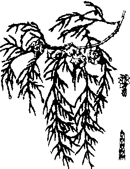 同属植物常见栽培的还有:西藏柏木(C.toru-losa),高达20m,生鳞叶小枝圆柱形,产西藏东部和南部。干香柏(C.duclouxiana),高达25m,树冠近球形或广圆形。喜光,较耐干旱,在深厚肥沃的钙质土上生长较好。种子繁殖,一年生苗高可达30cm。产中国云南、贵州、四川、甘肃,适生于冬春干旱而无严寒、夏秋多雨而无酷暑的环境。墨西哥柏木(C.lusitanica),高达30m,胸径1m,树冠尖塔形。树皮红褐色。鳞叶蓝绿色,具蜡质白粉。原产墨西哥,中国南京等地引种栽培。地中海柏木(C.sempervirens),高达25m,树冠圆柱形,树皮灰褐色,浅纵裂。原产欧洲东南部及亚洲西部,中国南京、庐山等地引种栽培。岷江柏木(C.chengiana),高达30m,胸径1m。枝叶浓密,小枝不下垂,鳞叶排成整齐的四列。产中国四川、甘肃等省。巨柏(C.gigantea),高达25~45m,胸径1~3(6)m。生鳞叶的小枝粗壮,四棱形,稀圆柱形,常被白粉,不下垂;鳞叶排成整齐的四列。产中国西藏。生长慢,寿命长达2500年以上,是用于园林绿化的优良树种。 柏木Chinese weeping cypress,mourning cypressCupressus funebris Endl.,又称垂丝柏、扫帚柏、柏树。柏科,柏木属。常绿乔木。分布于长江流域及以南各地,西至陕西南部,四川北部、西部。高达35m,胸径2m,树皮淡褐灰色。小枝细长下垂,叶枝扁平,排成一平面,两面同形,宽约1mm,绿色。鳞叶二型,长1~1.5mm,先端锐尖,中央叶背有条状腺点,两侧叶背有棱脊。球果二年成熟,球形,径0.8~1.2cm;种鳞4对,木质,盾形,顶端五边形或方形,中央有尖头或无。种子近圆形,长约2.5 mm,淡褐色,有光泽。喜光,能耐侧方庇荫。天然下种更新能力良好,侧根发达,能生于岩缝中。材质细致,有香气,供建筑、车辆、造船、木模、细木工等用材。球果、根、枝叶入药、治风寒感冒、虚弱咯血、跌打损伤、烫伤等病。枝叶、根可提炼柏木油,为产区石灰岩山地的造林树种。枝叶下垂,树冠浓密,可为庭园观赏树。
