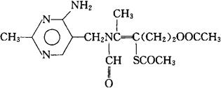 | 释义 | 乙酰硫胺 C16H22N4O4S=366.43 CAS-299-89-8 N[(4-氨基-2-甲基-5-嘧啶基)甲基]-N-(4-羟基-2-巯基-1-甲基-1-丁烯基)甲酰胺O,S-二醋酸酯。 N-[(4-Amino-2-methyl-5-pyrimidinyl)methyl]-N(4-hydroxy-2-mercapto-1-methyl-1-butenyl)formamide O,S-diacetate. 硫代乙酸与N-[(4-氨基-2-甲基-5-嘧啶基)甲基]-N(4-羟基-2-巯基-1-甲基-1-丁烯基)甲酰胺醋酸酯的S-酯。 Thioaeetic acid S-ester with N-[(4-amino-2-methyl5-pyrimidinyl)methyl]-N-(4-ydroxy-2-mer-capto-1-methyl-1-butenyl)formamide acetate. 维生素类药。 Acetiamine,Diacethiamine,O,S-Dicetylthiamine,D.A.T.,Vitamin B1 O,S-Diacetate,Thianeuron. INN,USAN,MI.