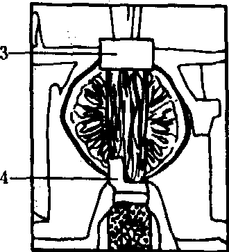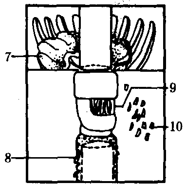 (d) 压榨结束,推出果皮 图1 FMC柑桔榨汁机榨汁过程 1.上爪形钵; 2.下爪形钵; 3.上刀片,将果实上半部分切出一个圆形开口; 4.下刀片,将果实下半部分切出一个圆形开口; 5.粗过滤用的筛管; 6.空心管; 7.果皮向上离开榨汁器; 8.滤出汁液和少许果肉的滤管; 9.果实在此处被空心管挤压;10.果皮和果皮油