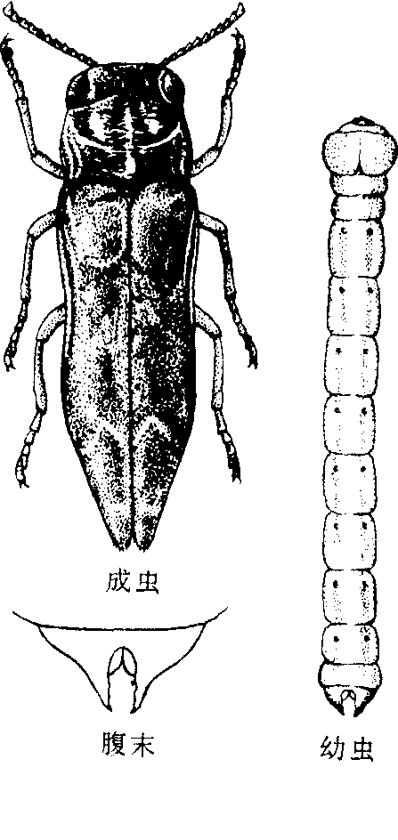 图1 柑橘爆皮虫 柑橘溜皮虫 学名Agrilus sp.。分布于中国浙江、福建、广西、广东、四川等省区。寄主植物为柑橘类。成虫体长10毫米左右,黑色,微带金属光泽,头顶两复眼间的凹陷刻纹呈两个清晰的多环同心椭圆。前胸背板上的横列皱纹较粗。鞘翅黑色,密布细小刻点,端部1/3处有清晰白斑,末端的小齿较爆皮虫更为细微、卵扁椭圓形,乳白色至黄色。末龄幼虫体长23~N6毫米,扁平,乳白色,头部小。前胸背板大,近圓形,中、后胸缩小。腹部各节呈梯形,后缘显较前缘为宽,腹末具一对钳状突(见图2)蛹纺锤形,体长9~12毫米,黄白色。在浙江,四川和福連年生1代,以幼虫在枝条木质部中越冬。翌年4月化蛹,5月成虫出洞。成虫出现期不整齐,因此产卵,孵化及幼虫蛀入木质部的时间也不一致。卵产于树枝表皮外面,常仃绿褐色保护物覆盖。幼虫孵化后,蛀入树枝皮层为害,初期被害处可见流胶,以后幼虫自枝条上部向下蛀食,在皮层与木质部之间形成虫道,枝条树皮剥裂。若围绕树枝蛀害则枝条养分不能运送而枯死。虫道末端形成螺旋状,有时在中段也出现一个螺旋状,末龄幼虫在最后一个螺旋处蛀入木质部越冬。蛀入孔新月形,羽化孔D字形。
