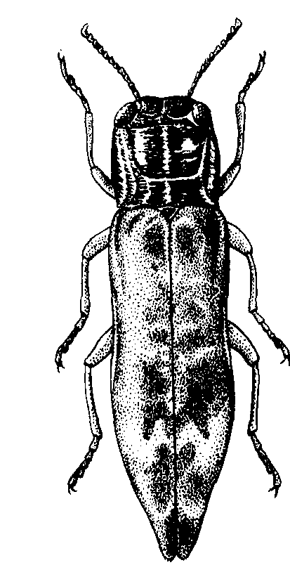 图 2 柑橘溜皮虫 六点吉丁虫 学名 Chrysobothris succedaneaSaunders。分布于中国广东、福建、湖南和浙江。成虫体长约11毫米,黑褐色,每一翅鞘上有3个金属青色圆斑。末龄幼虫体长18毫米,前胸宽大,较其他各体节大得多。前胸背板和腹板密生小刺突,背板具V形沟,腹板中央有一不完全的纵沟。腹部末端无坚硬的钳状突。幼虫为害状与柑橘爆皮虫相似,但虫道较粗短。 柑橘吉丁虫的防治方法是:❶冬、春成虫出洞前剪除虫害枯枝,砍除烧毁虫多枯死的橘树。 ❷用小刀削除枝干流胶处的初期幼虫,或用刀刮去流胶处一层薄皮,涂80%敌敌畏或20%亚胺硫磷乳剂加水(1:3),以触杀皮层内的幼虫。 ❸春季成虫出洞前,上一年虫害发生严重的树,用稻草从树干基部自下而上边搓边捆,紧密捆扎,并涂刷泥浆。可阻止成虫出洞和产卵,且有助树体伤口愈合。 ❹成虫发生期树冠喷洒敌敌畏,敌百虫,亚胺硫磷或乐果乳剂,或在树干涂药。 |
