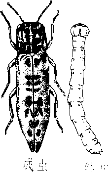 柑橘溜皮虫Agrilus sp.,又称柑橘缠皮虫。昆虫纲、鞘翅目、吉丁虫科。分布于浙江、福建、广东、广西、四川。寄主仅为柑橘类植物。成虫体长约10mm,黑色,微带金属光泽。鞘翅密布细小刻点,上有由白色绒毛形成的不规则花斑,鞘翅末端约1/3处的白斑最为清晰。末龄幼虫体长23~26 mm,体扁平、白色。前胸背板大,近圆形,中、后胸缩小,腹部各节呈梯形,后缘显著较前缘宽,各节两侧近后缘处突出成角状。中国一年发生1代,以幼虫在枝条木质部中越冬,翌年3~4月间在蛀道内化蛹,夏季为成虫外出时节。卵黏附于树枝表皮外面,常覆盖绿褐色保护物。幼虫喜在小枝上为害,被害处出现泡沫。虫道形成复杂,凡幼虫蛀害经过之处,枝条皮层剥裂。宜在冬、春剪除虫害枯枝,成虫发生期树冠喷洒敌敌畏、敌百虫、亚胺硫磷或乐果乳剂,也可在树干涂药毒杀。