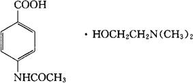 C13H20N2O4=268.31 CAS-3635-74-3 4-(乙酰氨基)苯甲酸与2-(二甲氨基)乙醇的化合物。 4-(Acetylamino)benzoic acid compd with 2-(dimethylamino)ethanol. 2-(二甲氨基)乙醇对-乙酰胺基苯甲酸盐。 2-(Dimethylamino)ethanol p-acetamidobenzoate. 抗抑郁药,精神兴奋药。 醋胺苯甲酸地阿诺。 Deanol Acetamidobenzoate,Bimanlo,Deaner,Diforene. MI.  |