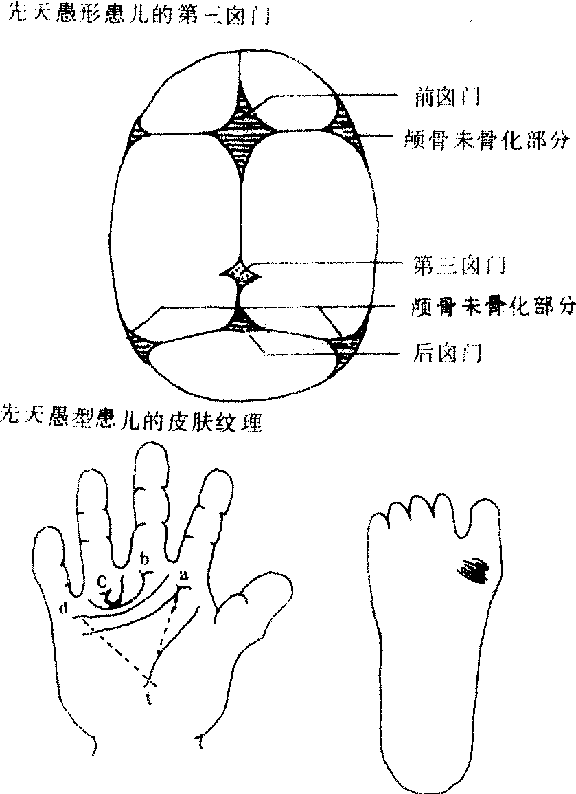 图600 先天愚型 组的个体叫一倍体(1x),含2个基本染色体组的叫二倍体(2x),含3个、4个……m个基本染色体组的叫三倍体(3x)、四倍体(4x)……m倍体(mx)。体细胞中含3个和3个以上基本染色体组的个体叫多倍体。在多倍体中,若基本染色体组来自同一物种的,叫同源多倍体(参见“无籽西瓜”条);若基本染色体组来自不同物种的,叫异源多倍体(参见“小黑麦”条)。(2)非整倍体:体细胞中以二倍体(2n)染体数为标准,增减个别染色体后的个体。如果减少1条染色体,叫单体(2n-1);如果增加1条染色体,叫三体(2n+1);如果减少1对同源染色体,叫缺体(2n-2)。在人类的一种遗传病,先天愚型的体细胞染色体数为2n+1=47,为三体。经显微镜检查,多的是第21号染色体,所以这种遗传病又称21三体。产生原因是母亲的性母细胞减数分裂时,第21对染色体没分离,从而产生具24条染色体的卵子(1n+1=24)。这样的卵子与正常精子(1n=23)结合,发育成先天愚型(2n+1=47)。患者呈特殊的呆滞面容,头小、后脑低平,鼻根平,下颌小,口常半开;初生儿常有第3囱门(图600),发育迟缓,智力迟钝,患者掌纹中,主线C走向中指和无名指间,atd角约70°;拇趾球区有胫侧弓状纹。☚ 单倍体 多倍体 ☛ |