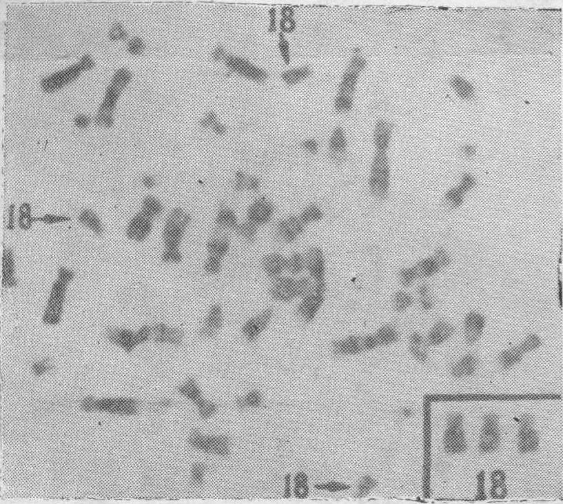 图1 45,XO患者的外观及核型图 调查在新生儿中发生率约为1/5000。三体型:细胞染色体数为47条,某一号染色体有3条的个体,这是人类染色体数目异常中最多的一类。至今已报道的核型有: ❶47,XX或XY,+8: 自Warkany等1962年报道以来,已有十余例记载,其主要特征有智力发育不全,头异形,关节活动障碍,椎骨异常,多肋,斜视髌骨缺如,短颈,腭裂,深而特有的手掌和足底皱纹。 ❷47,XX或XY,+9:1973年分别由Feingold和Haslam等首先报道,患者具有小头,精神和身体发育障碍,低位耳,关节脱位,小阴茎,隐睾和各种先天性心脏病。 ❸47 XX或XY,+13 (Patau综合征):虽然Bartholin在1957年记述了该病的临床特征,但直到1960年才由Patau证明是13号染色体三体型。现已报告200余例。分娩中发生率约为1/5000~1/6000。平均分娩体重约2500g,常具单一脐动脉,仅5%的病例能生存3年多,在已报告的病例中最大年龄为10岁。其共同特征是智力发育障碍,耳聋,小头,无嗅脑。75%具有眉间区毛细血管瘤。60~70%有唇裂和/或腭裂和小颌,多指(趾),摇椅状足底。80%有先天性心脏病,90%以上的男性具隐睾,50%的女性具双角子宫和发育不全的卵巢。❹47,XX或XY,+18 (Edwards综合征): 最先由Edwards等(1960年)和Patau等(1961年)所描述,指出有一条额外的E组染色体,接着Yunis等(1964年)证明为18号染色体三体型(图2)。其主要特征是生长、发育障碍,肌张