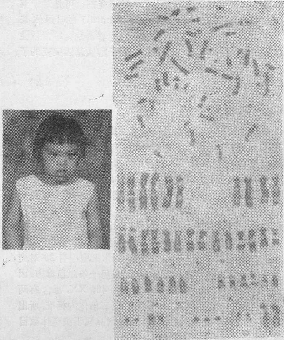 图2 47,XX,+18患者的中期染色体照片及部分核型图 力亢进,髋关节外展受限,手指尺向弯曲,胸骨短,先天性心脏病,短而弯曲的大趾,摇椅形足底,隐睾,枕骨部突出,耳廓低位畸形,小颌等。值得注意的是18号三体型与桡骨发育不全和血小板减少症有一种罕见的联系。在新生儿中的发生率约为1/3500至1/7000。❺47,XX或XY,+21(Down综合征,21三体型):1866年由Down首次记载,1959年Lejeune证明与一个额外的G组染色体相关,以后多数作者认为该类患者的21号染色体有三条;1965年Yunis等用放射自显影方法证明该类患者的G组中小的染色体(即22号)有三条,1971年巴黎会议为了既改正以前有关21三体型是G组中大号染色体有3条的错误认识,又照顾已有资料中把先天愚型当为21号染色体三体型的习惯,特将染色体丹佛(Denver)体制中的21和22号染色体的编号作了颠倒,即将其中较小的那对染色体排为21号,较大的那对染色体排为22号。该类患者在居民中的发生率约为1~2‰。主要特征是智力低下,发音迟缓,眼裂外斜,内眦赘皮,宽眼距,上腭高尖,张口吐舌,通贯手,男性伴有一侧睾丸不降(图3)。 ❻47,XX或XY,+22: 即22号染色体有三条。其特征包括智力和身体发育障碍,小头,小颌,腭裂,耳大而低位,耳前有皮赘和窦道,肌张力亢进,手指长而极其柔软等(图4)。 ❼47,XXX: 多数患者有智力低下和生长发育迟缓,宽眼距,内眦赘皮,上腭高尖,原发型闭经,第二性征发育差等特征。 ❽47,XXY(Klinefelter综合征,或先天性