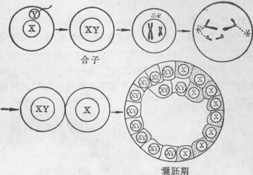 图7 示受精卵早期卵裂中染色体不分开所形成的嵌合体(XO/XYY)