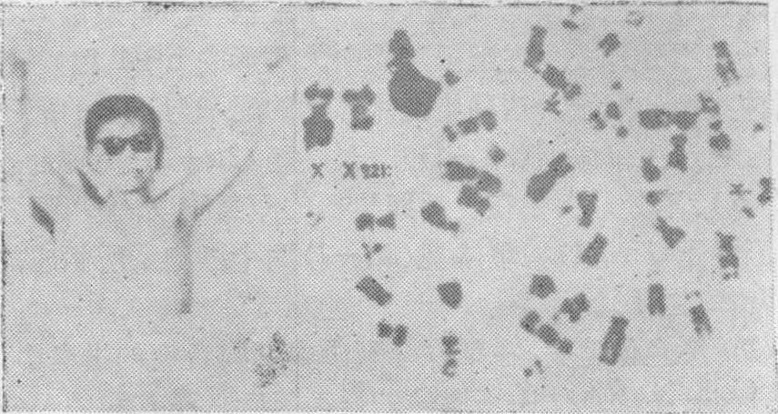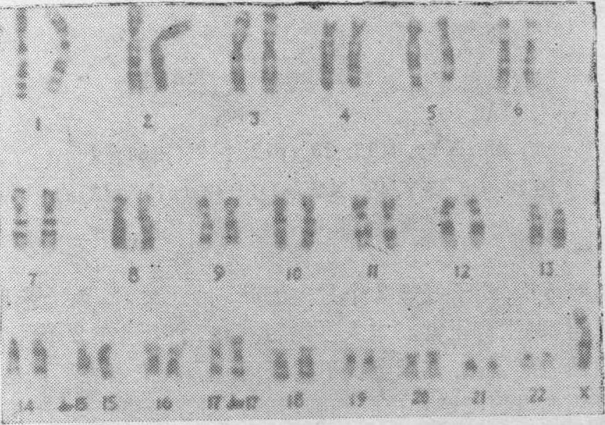 图4 22三体型患者外观及核型图 睾丸发育不全症):1942年由Klinefelter首次记载,1959年由Jacobs等确定核型为47,XXY。其发生率占一般男性的1‰,占男性精神发育不全病人的1%,占男性不育症的1/10。主要特征是曲精细管发育不全,睾丸小,