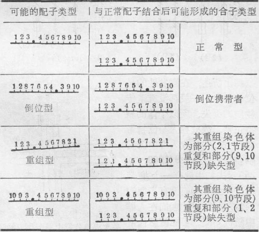图13 示在倒位节段携带者的第一次成熟分裂中期,可见的倒位圈示意图 之间的交换,理论上可形成4种不同的配子,其中有2种配子各带有一条重组染色体。它们分别与正常的配子相结合,则可形成4种类型的合子。其中仅一种为正常者;一种为表型正常的倒位携带者;其他两种为部分重复和部分缺失的重组型(表1)。表1 示由臂间倒位节段携带者所产生的配子与正常配子结合所形成的合子类型