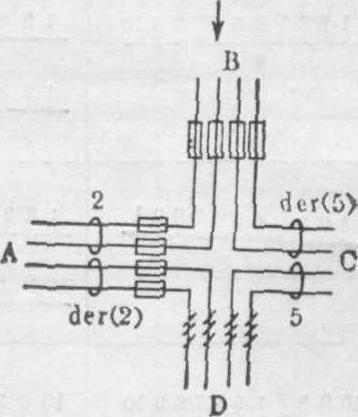 图17 示相互易位携带者第一次成熟分裂中期所形成的四射体。A、B、C、D代表各号染色体末端至断点的染色体节段 表2 相互易位携带者可能产生的18种类型的配子及其与正常配子结合可能形成的合子类型