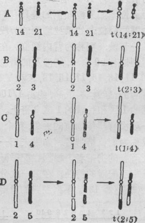 图16 示各种类型的易位染色体的形成。A.罗伯逊易位,B.整臂易位,C. 单方易位,D.相互易位