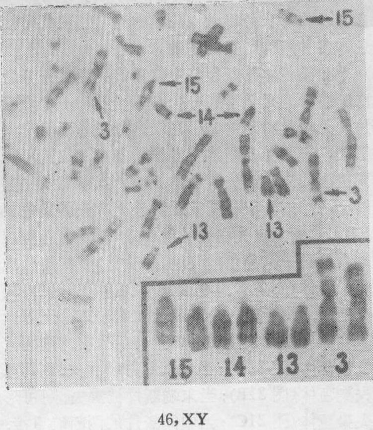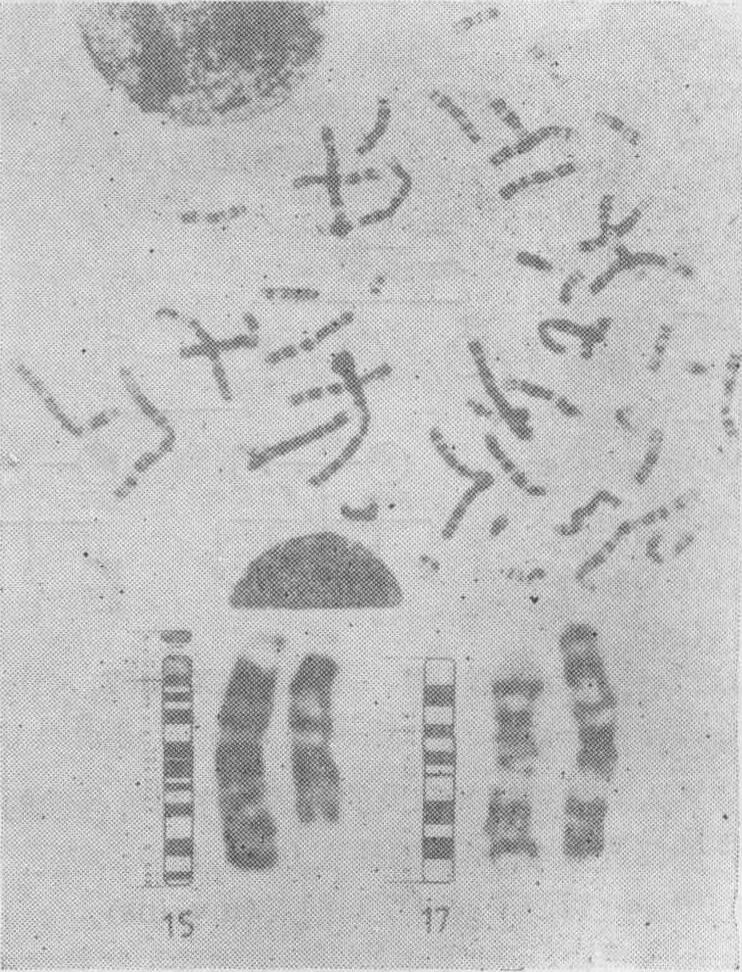 图18 46,XY/45,XY,t(13; 13)(p12; p12)的罗伯逊易位型嵌合体的染色体图 流产8次,均于妊娠2个月内流产,因此离婚,女方与他人再婚、生育正常。本人再婚后,第二个妻也在2个月内自然流产3次,临床上找不到任何原因。夫妻表型正常,外周血淋巴细胞和皮肤细胞培养及G显带染色体分析,其妻核型正常,本人核型为46,XY/45,XY,t(13;13)(图18),是一个同源的13号染色体之间的罗伯逊易位型的嵌合体。在淋巴细胞中异常核型占64%,在皮肤细胞中异常核型占45%。46,XY或XX,t (15; 17) (15pter→15q22.3::17p13.1→17pter; 17qter→17p13.1::15q22.3→