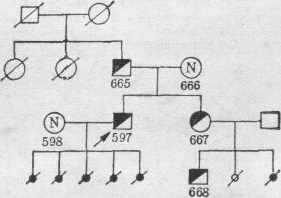*要产生这四种类型的配子,必须在着丝粒和交换点之间的中间节段中发生交换。 46,XY/45,XY,t(13;13)(13qter→13p12::13p12→13qter):携带者,男,38岁,结婚2次,第一个妻自然