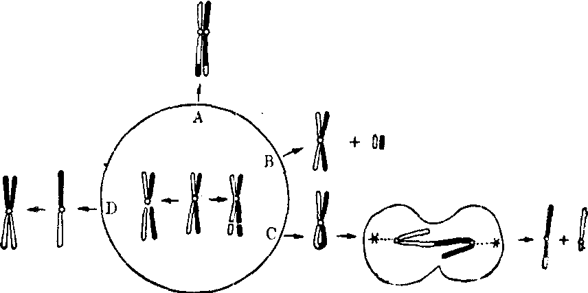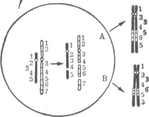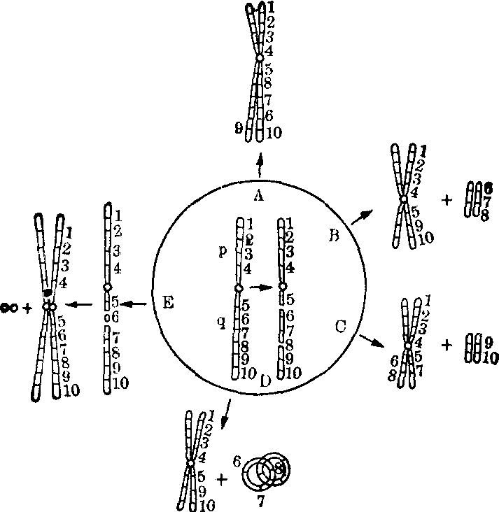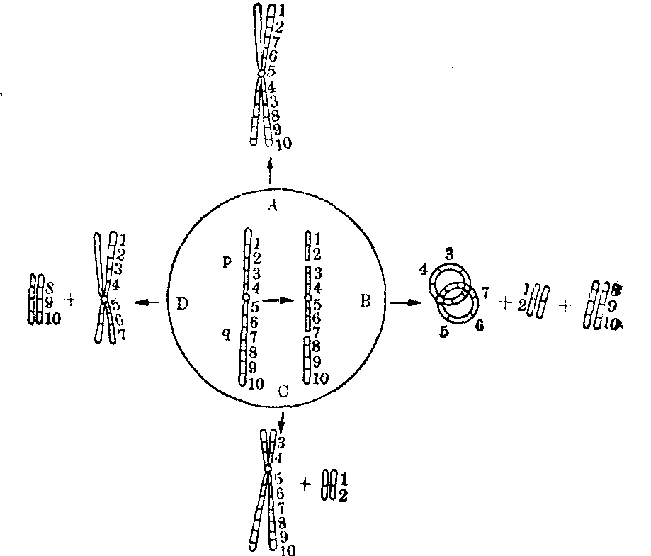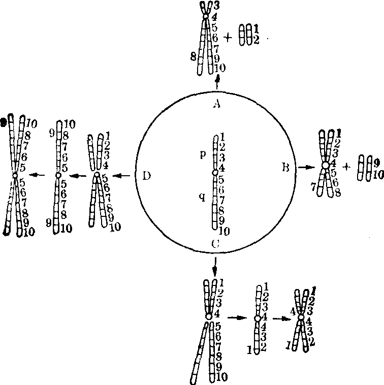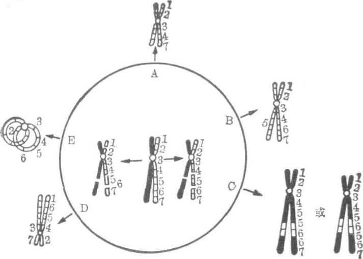 图22 示单条染色体的长短两臂同时各发生一次断裂后可能引起的染色体结构畸变