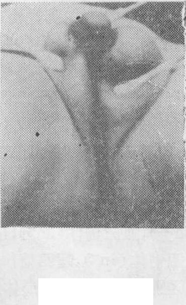 图27B 45,XO/46,XX/47,XX,t(Y; Y)(pl; q11)嵌合体患者的外观及外生殖器 别男,智力正常,高105cm,外生殖器畸形,阴茎长2cm,直径1cm,远端龟头样膨大,由两支阴茎海绵体组成,未见尿道海绵体,尿道口径为0.9cm,位于阴茎基部,阴囊细小,分两半,右侧空虚,左侧有一睾丸与附睾(图27B),镜检睾丸有大量曲细精管,散在睾丸间质细胞,附睾内衬柱状上皮,有纤毛细胞。左侧盆腔由有一个末端具有繖部结构酷似输卵管的管状物,其下方有一个3×0.3×0.2cm的主要由胶原纤维所组成的条索状物。外周血、皮肤、条索状性腺染色体检查均为具有三种细胞的嵌合体。血型分析为纯一的A型,MN型,P阳性、CCDe型,证明患者起源于同一个合子。 (2) 异源嵌合体: 当两个具有正常染色体组的X精子和Y精子同时使一个正在孤雌分裂的卵子的两个卵裂细胞受精,或使两个分离的卵子受精所成的两个胚胎,后来融合;或使一个卵核和一个极体受精;均可形成具XX/XY性染色体组成的雌雄嵌合的异源嵌合体(图28)。其
