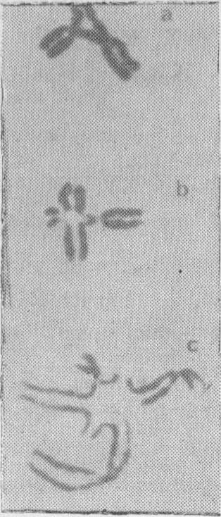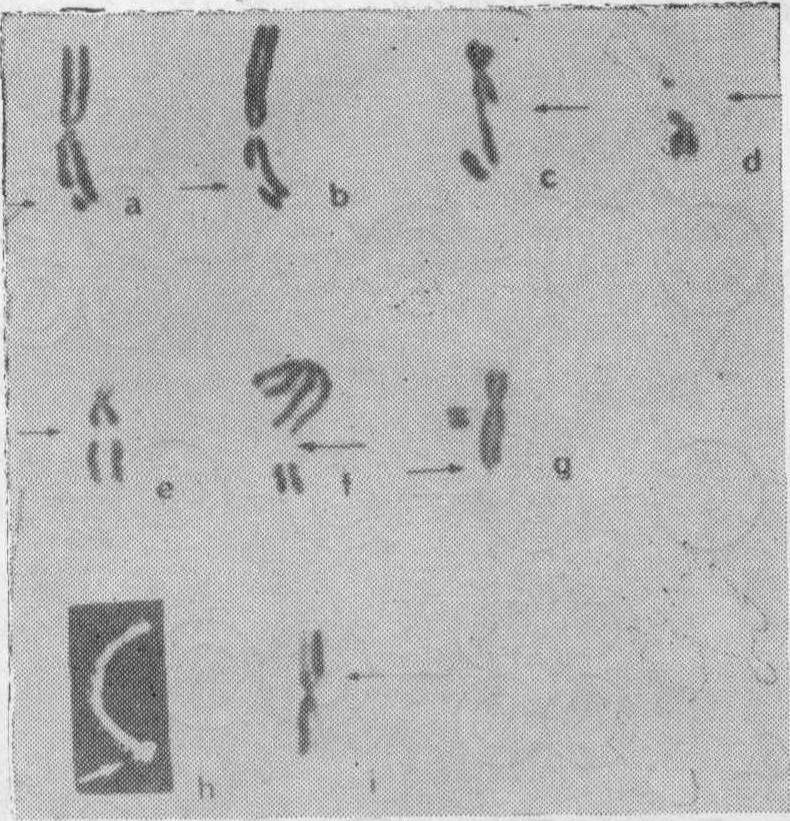 图30 a. 示三射体b. 示四射体c. 示复合射体 单体倒位(ct inv) 这是只有在显带染色体标本上才能鉴定的畸变,前者系指某一染色体的单一染色单体的某一带型顺序的缺失;后者系指某一带型顺序的被颠倒。染色体畸变 在某一染色体的两条染色单体的同一座位上发生的畸变。 染色体裂隙(csg) 一个染色体的两条染色单体的同一位点上的一个非染色质损伤的不着色区。它是等位裂隙和等位染色单体裂隙的同义词(图29e)。 染色体断裂(csb) 一个染色体的两条染色单体的同一座位上的具染色质损伤的间断,将导致产生一个无着丝粒的断片和一个异常的单着丝粒染色体(图29f、g)。染色体交换(cse) 两个或多个染色体断裂后,同一染色体的两个染色单体重接到同一染色体或另一染色体的某一新的位置上的情况。 微小体(min) 是一种比染色单体宽度还小的无着丝点断片。它可以是单一的或成双的。 粉碎(pvz) 系指某一细胞中出现的,其数目不可能计算的染色单体和染色体裂隙或断裂的情况。偶然地,在一个细胞内仅一个或几个染色体被粉碎而其余的染色体形态正常。例如pvz(1)表示在一个细胞内仅具有一个被粉碎的1号染色体。 染色体提前凝缩(pcc) 指一个细胞核处于分裂间期(G1、S、G2期)的细胞提前进入有丝分裂期的状况。当一个处于S期的核遭受pcc时常出现粉碎现象。 标记染色体 一条形态异常的染色体,在某一肿瘤及其细胞株的全部或大部分细胞中存在,这样的染色体一般就被称为该肿瘤及其细胞株的标记染色体(mar)。标记染色体的存在常常是说明某一肿瘤及其细胞株起源于同一个祖先细胞的有力证据。 克隆(Clone) 指由单个祖先细胞经过有丝分裂发展而来的细胞群体。一般当某一细胞群体的全部或多数细胞具有同样或者有关异常的染色体组成的时候,常推论其起源于同一个克隆。 肿瘤细胞群体 众数(mn) 在直接检查某一肿瘤或经过短期培养的肿瘤细胞群体的染色体时,其中大多数或多数细胞所具有的染色体数目叫做该肿瘤细胞群体的众数。当某一细胞群体的众数接近于二倍体时可称为近二倍体(2n+),当其众数细胞的染色体数小于46时叫亚二倍体(2n-);相反,当其大于46时叫超二倍体(2n+)。当某一细胞群体的众数无法精确地计数,但其染色体数目位于或者近似于三倍体或四倍体范围内时,可以相应地叫近三倍体(3n±),亚三倍体(3n-),超三倍体(3n+);近四倍体(4n+),亚四倍体(4n-),超四倍体(4n+)等。其中2n+和3n-之间的区别是: 2n+细胞群体的大多数细胞的染色体数目小于2n+n/2;相反,3n-的大多数的染色体数目大于2n+n/2。其他3n+和4n-的区别可据此类推。当某一细胞的染色体数目等于某一倍数性的水平,但带有获得性的数目和/或结构畸变的染色体时,可相应地叫做假二倍体和假三倍体。 干系(sl) 在一个直接的或经过短期培养的肿瘤细胞群体标本中,所观察到的最常出现的染色体构成的细胞系叫干系。如果这个肿瘤细胞群是经过长期培养的,则应用符号in vitro(体外培养或离体培养)。在一个肿瘤细胞群体中除了干系外的其他细胞系,可称作副系(sdl)或亚系(sub-line)。当一个肿瘤细胞群体的许多细胞系具有某一共同的标记染色体时,则说明该肿瘤细胞群体可能是一个起源于同一祖先细胞的克隆。为了清楚地记录某一肿瘤的染色体构成,一般采用两个用句号分开的符号系列。第一个系列是指出带有某一个染色体数目的各类细胞数; 第二个系列是指出已经过核型分析的带有不同的染色体组成的各类细胞数。例如:46=5/49=10/52=4。46,XY=2/49,XY,+1,+8,+12=9/49,XY,+X,+1,+7=1/52,XY,+X,+X,+1,+7,+22,+22=4。说明这个肿瘤共计数了19个细胞。有5个细胞具有46条染色体,10个细胞具有49条染色体,4个细胞具有52条染色体。核型分析有2个细胞为46,XY;9个细胞为49,XY,+1,+8,+12; 一个细胞为49,XY,+X,+1,+7;4个细胞为52,XY,+X,+X,+1,+7,+22,+22。 ☚ 基因突变 染色体多态 ☛ 染色体畸变 染色体畸变人体染色体数目及结构是比较稳定的,不因种族、肤色及地区而有所不同。染色体的数量及染色体上基因间的一定排列顺序和空间关系的完整性,对人体的正常发育是不可缺少的。由于某种内因或外因引起染色体数目或结构发生变化,这种变化称为染色体畸变或染色体异常。常染色体及性染色体均可发生畸变。由于染色体畸变,破坏了染色体的完整性,引起的疾病称染色体疾病或染色体异常综合征。在人类中,已发现300余种染色体病,在一般人群中其发生率为5%,在新生活婴中占1%。