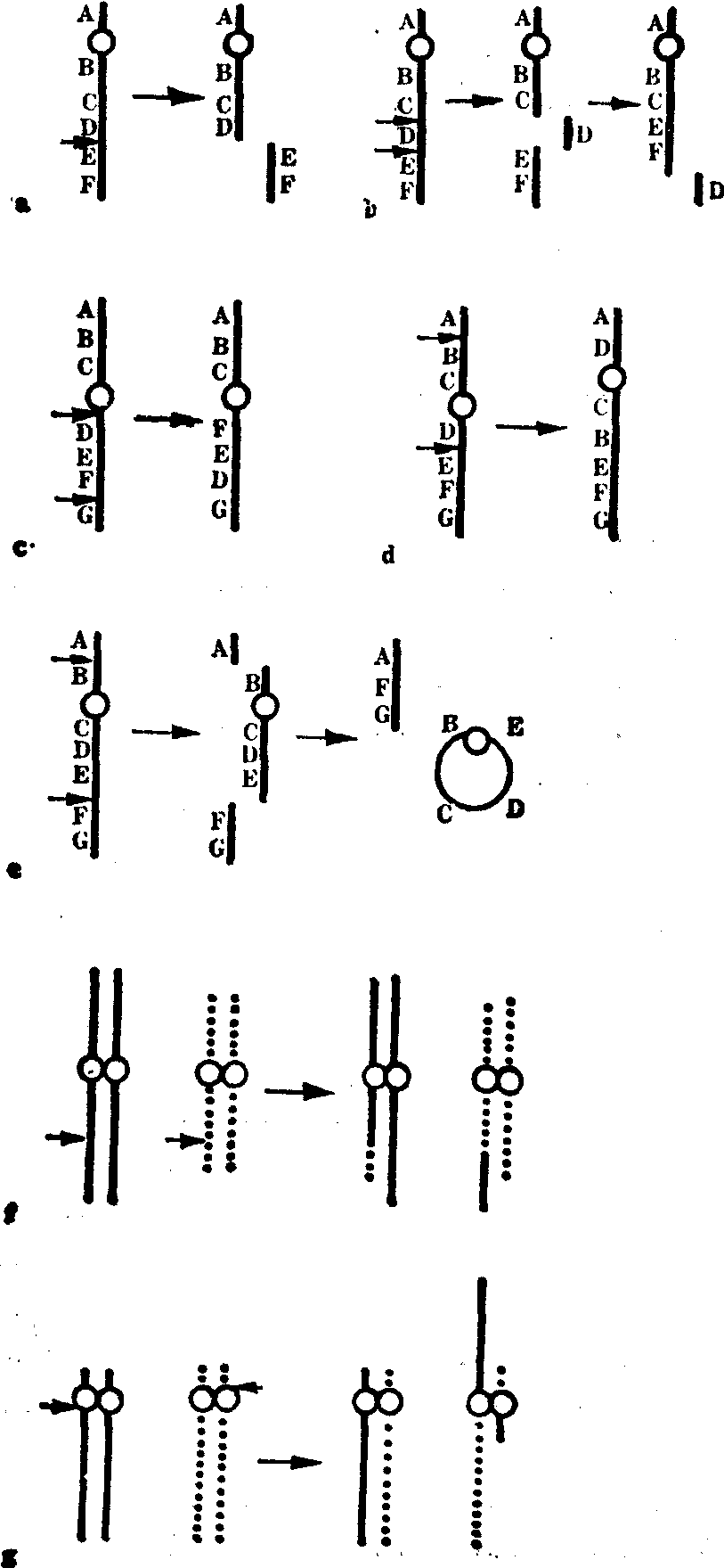 图28 示异源染色体形成的可能途径 染色体诱发畸变 又称获得性染色体畸变,可参见下页的附录。 附录 获得性染色体畸变(自ISCN,1978) 指机体的细胞在后天的各种内外诱变因素的影响下所发生的染色体畸变和染色单体畸变。这种畸变发生在体细胞中可遗传给子细胞,发生在生殖细胞中可遗传给其子代。其主要类型如下: 染色单体畸变 在某一染色体的一条单体上发生的畸变。 染色单体裂隙(ctg) 位于一条染色单体上的一种非染色质损伤所引起的非染色区 (图29a、b)。 染色单体断裂(ctb) 位于一条染色单体上的一种具有清楚的非线形性节段的间断(图29c、d)。
