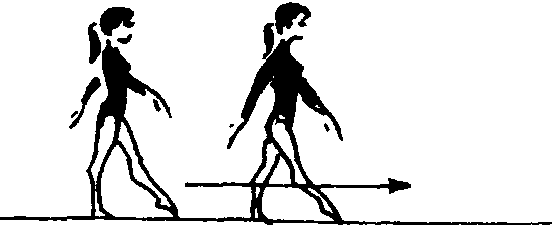 是艺术体操中最基本的走步,两脚平均地交替行进,行进时要求脚面绷直略向外转,由拇指自然过渡到全脚掌着地,重心前移,身体正直,两眼平视,两臂从肩以下自然摆动。