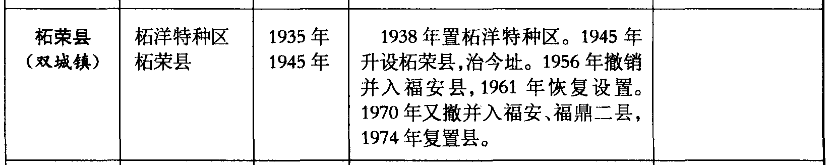 柘荣县(双城镇)柘洋特种区柘荣县1935年1945年1938年置柘洋特种区。1945年升设柘荣县,治今址。1956年撤销并入福安县,1961年恢复设置。1970年又撤并入福安、福鼎二县,1974年复置县。