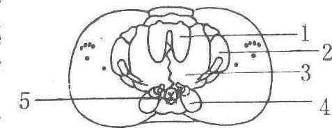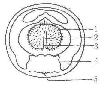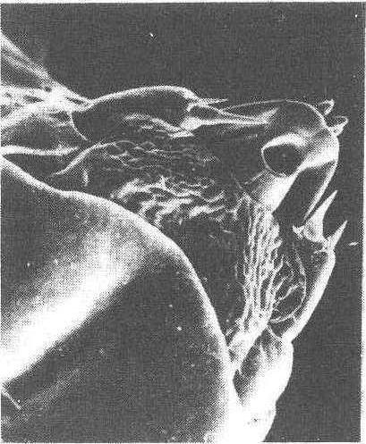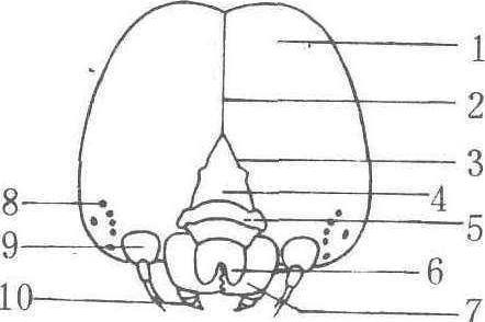 形,褐色骨质硬壳,表面有对称的刚毛和黑斑,2龄始头部表面有多数圆锥形突起,头部正面中央有倒Y 字形线缝 (中冠缝及头盖缝组成),外侧有2条浅线为蜕裂线(图1)。头部两侧下缘上颚基部着生一对触角。触角由3节构成,第2节外侧方有两根长短不一的感觉毛,第2、3节端部分别着生3个、4个圆锥形感觉突起,都具感觉作用(图2)。头部两侧下缘,触角稍上方有6对 单眼,呈黑褐色半球形隆起,表面光滑,是感光器官。口器在唇基下方,由上颚、下颚、上唇、下唇4部分组成(图3)。上唇基部和唇基相连为骨质薄片,食叶时有调整叶片位置的作用。上唇正中央有缺刻,
