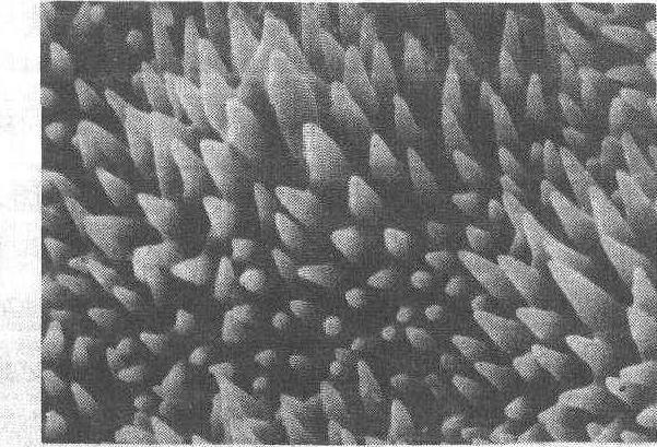 图5 柞蚕5龄幼虫体表圆锥形突起 端有一褐色骨化钩爪,辅助取食爬行。第3~6腹节及第10腹节的腹面各有一对腹足,为肉质无节构造,其先端内缘有钩爪,1龄钩爪呈半环状单序排列,3龄始呈双序近弧形排列,腹足主要用于爬行,抓着柞枝,固定位置(图6)。在第1胸节及1~8腹节两侧各有一对气门。蚁蚕气门近圆形,其余各龄均呈长椭圆形,周缘为淡褐色气门片,内有树枝状筛板气门是幼虫呼吸的门户。