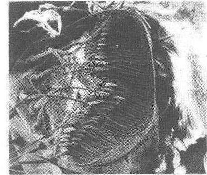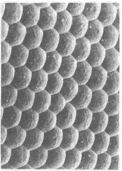 柞蚕成虫 柞蚕雌蛾大于雄蛾,除节间膜外,全身被有黄褐色鳞片,头部很小,被鳞片,胸部3节高度骨化,中、后胸有发达的翅,腹部在外观上雌蛾可见7个环节,雄蛾可见8个环节。触角在头部两侧,复眼上方,雌蛾呈双栉齿状,雄蛾呈羽状。主干由30几个小节构成,每一小节向两侧横向派生一对侧枝,侧枝表面着生多数感觉毛(图8)。主干侧枝表面还着生多数圆锥形突起。复眼在触角下方,呈黑色半球形构造,表面有排列整齐的六角形小眼似蜂窝状(图9)。口器已退化,下颚及下唇须较明显,下颚为白色囊状,表面有多数微皱、小孔及少量刚毛,下唇须由3节构成,表面被有鳞片。鳞片的形状可分叶状、毛状、纺锤状三种,其分布因部位而略见差异。扩大观察鳞片表面有纵走的脊椎状隆起,中间有细绒毛状物。胸足由5节构成,即基节、转节、腿节、胫节、跗节。跗节由5小节构成,其先端有2个黑色骨化钩爪,之间有爪间体,钩爪基部两侧外方着生褥盘,前足胫节端部有发达的距,其表面有许多针状突起。气门在第1胸节及1~7腹节两侧,呈半月形,筛板不很发达,筛板的侧枝上微见小突。雄蛾外生殖器由9、10腹节形成,包括抱器、钩器、阳茎(图10)。抱器位于阳茎外侧方一对大形附属器,包括表面有刚毛的上枝为第1抱器,下枝为第2抱器及内表面分出的一个骨化突起为第3抱器。钩器位于左右抱器之间,阳茎腹面有骨化的钩状突,阳茎突出于第9腹节腹面中央的骨化的棒状,端部有射精孔。雌性外生殖器由8、9、10腹节形成,包括侧唇、锯齿板等。侧唇由9、10腹节愈合,呈白色半球形囊状体。表面有多数感觉毛,正中央裂缝有2个孔口,上端是肛门,下端是产卵孔。锯齿板由第8腹节腹板形成,高度骨化。其腹前方为交配孔开口(图11)。