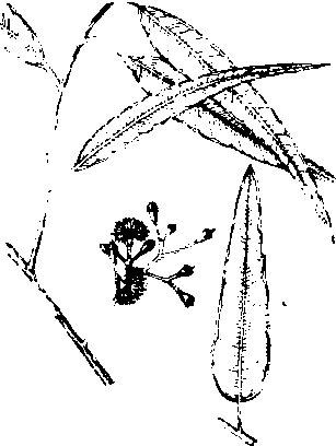 柠檬桉lemon eucalyptusEucalyptus citriodoraHook.f.,桃金娘科,桉属。常绿大乔木,高达可40 m,胸径1.2m。树干挺直。树皮光滑,灰白色,大片状脱落。幼态叶披针形,叶柄盾状着生;成熟叶狭披针形,长10~15 cm,稍弯曲,两面同色,均具黑色腺点,有柠檬气味。圆锥花序;子房下位;萼管长约5mm;花被帽状。蒴果壶形,长1~1.2cm。原产澳大利亚东部及东北部海岸地带。中国广东、广西及福建南部有栽培,多作行道树。喜湿热,不耐寒,宜酸性土壤。木材纹理直,易加工,耐海水浸渍,为造船优良木材。叶可蒸提桉油,供香料用。