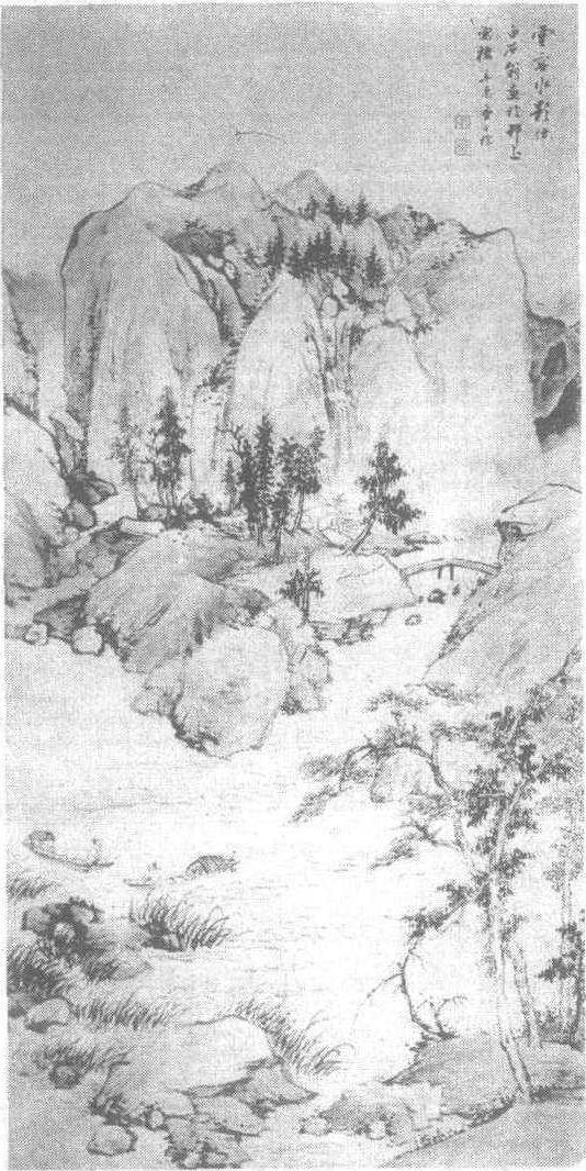 | 释义 | 查士标云容水影图轴 查士标云容水影图轴清。查士标绘。纸本浅绛。纵143.6厘米,横72厘米。天津市艺术博物馆藏。查士标(公元1615—1698年),字二瞻,号梅壑散人,安徽休宁人,流寓江苏扬州。明末诸生,精鉴别书画、铜器,工诗文,擅画山水。初师法倪瓒,后参用吴镇、董其昌法,意境荒寒,笔墨疏简,与弘仁、孙逸、汪之瑞并称为新安四大家,著《种书堂遗稿》。此图绘山野近景,浑厚朴质的山峰巍然而立,似巨大屏障,茅屋隐逸于洼地,山间溪流曲折奔腾,汇成一宽阔的河流。两岸怪石突兀,苇丛、疏树极富生气。河中两小舟相聚,渔人相互答应,自得其乐。作者以干笔皴擦,笔格遒劲老道,有清逸恬静之气,是一幅诗意浓郁、境界优美的图画。此画作于康熙二十年(公元1681年)。